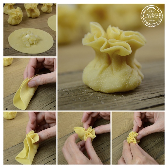 - Stendete la pasta in una sfoglia sottile, tagliate dei cerchi con un coppapasta, mettete al centro un po' d'impasto e chiudete facendo dei pizzicotti e dando la forma di un fagottino.